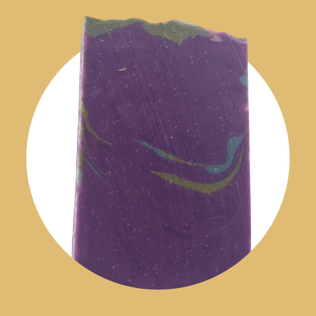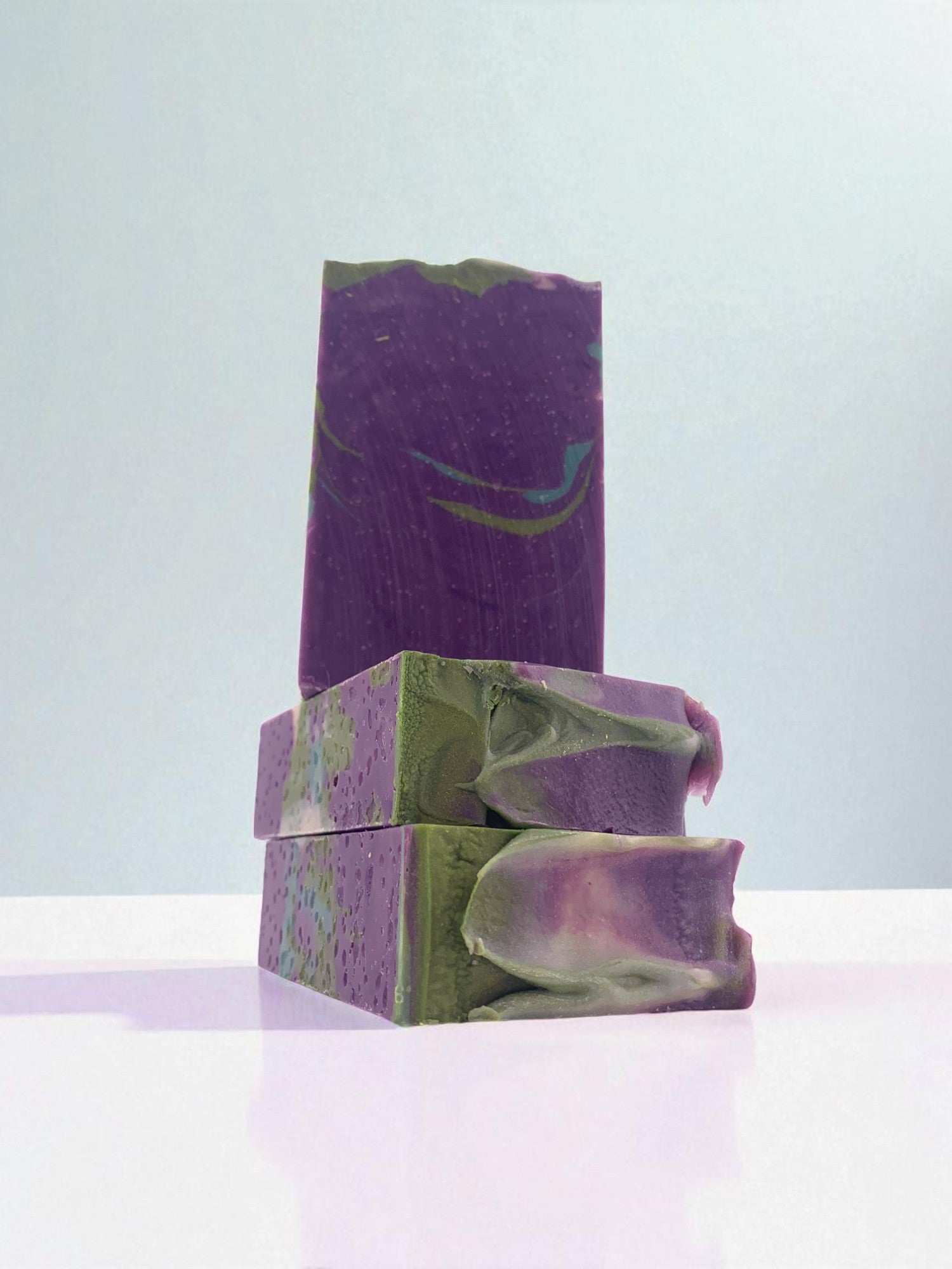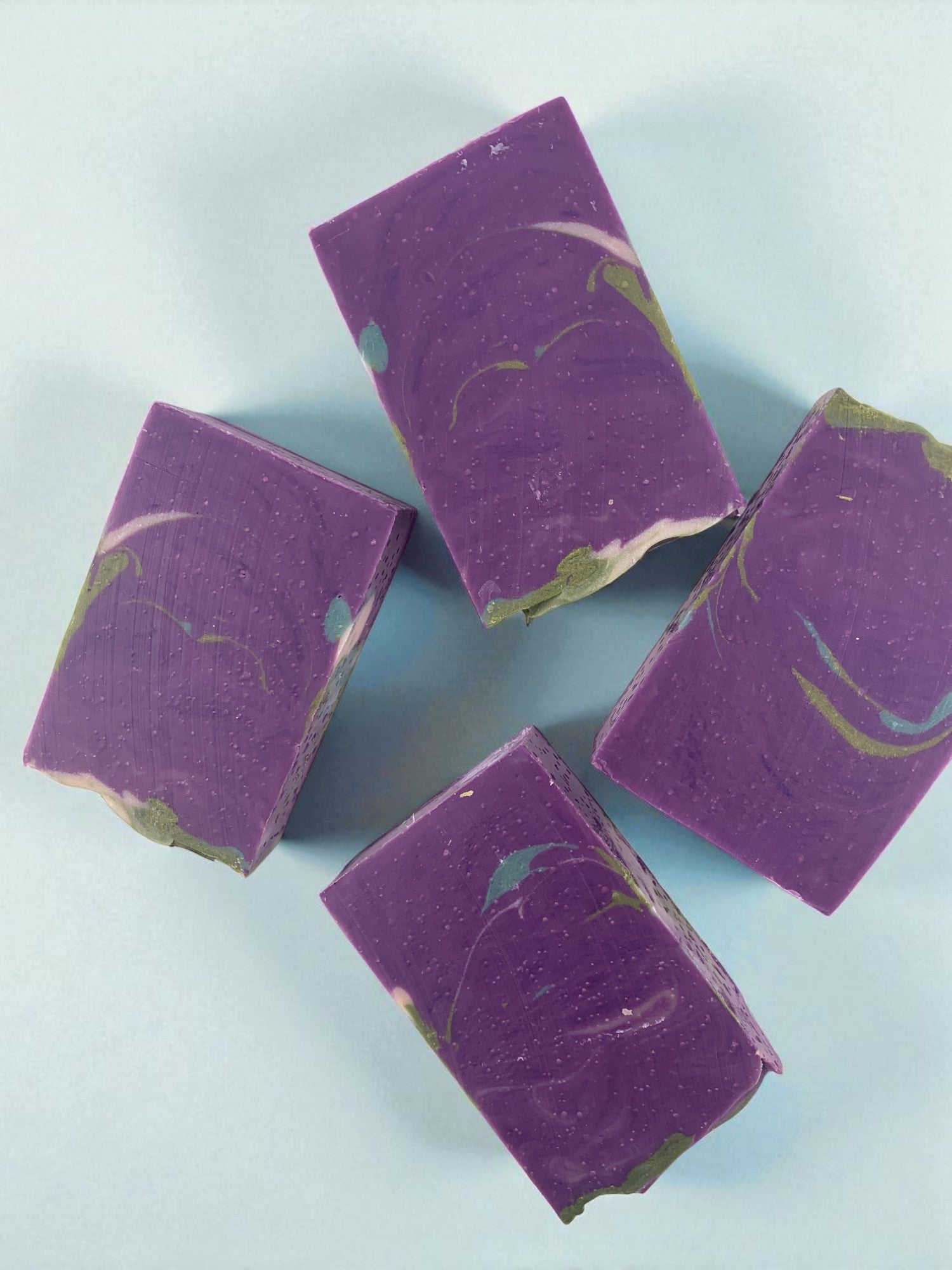 Ingredients: Olive oil, water, shea butter, babassu oil, coconut oil, sodium hydroxide, canola oil, kokum butter, rice bran oil, colorants (micas), fragrance, tussah silk fibers