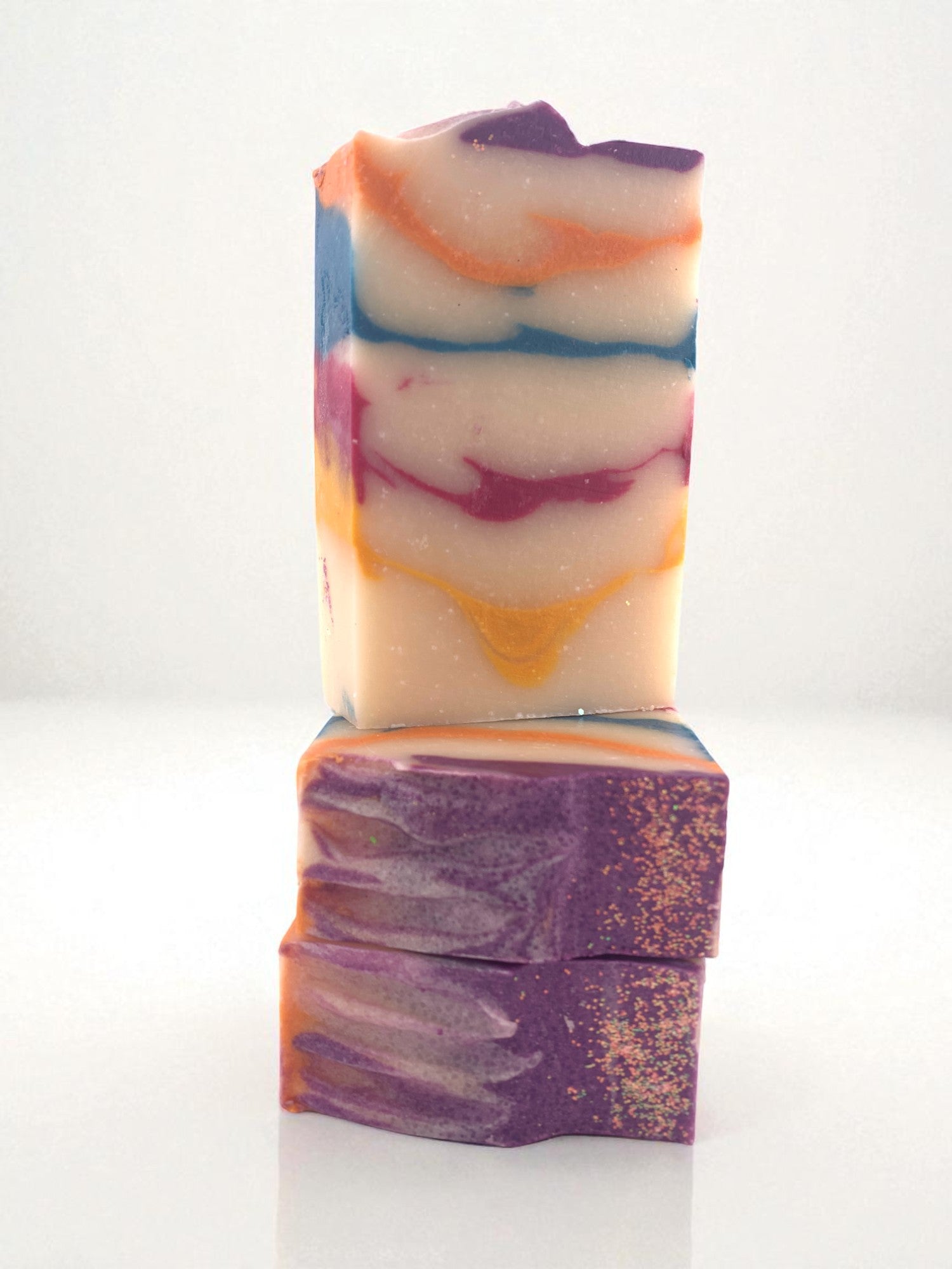 Ingredients: Olive oil, water, shea butter, babassu oil, coconut oil, sodium hydroxide, canola oil, kokum butter, rice bran oil, colorants (micas), fragrance, tussah silk fibers